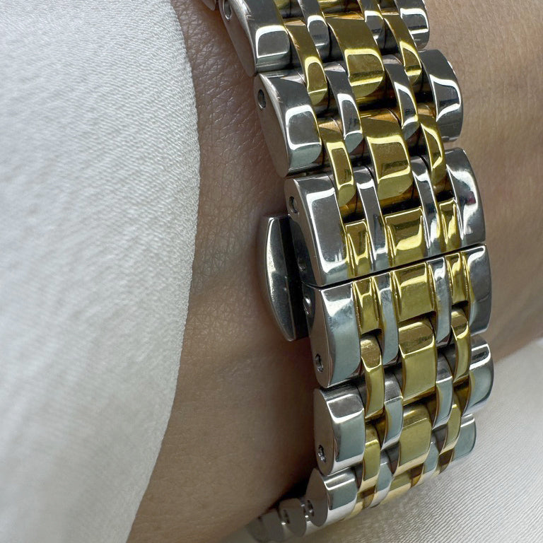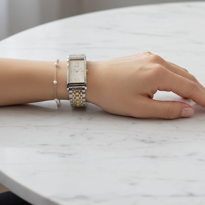 Das schlanke, geschwungene Gehäuse zitiert die Ästhetik der 1920er Jahre und interpretiert Art-Déco-Stil modern und tragbar. Die grazile Form schmiegt