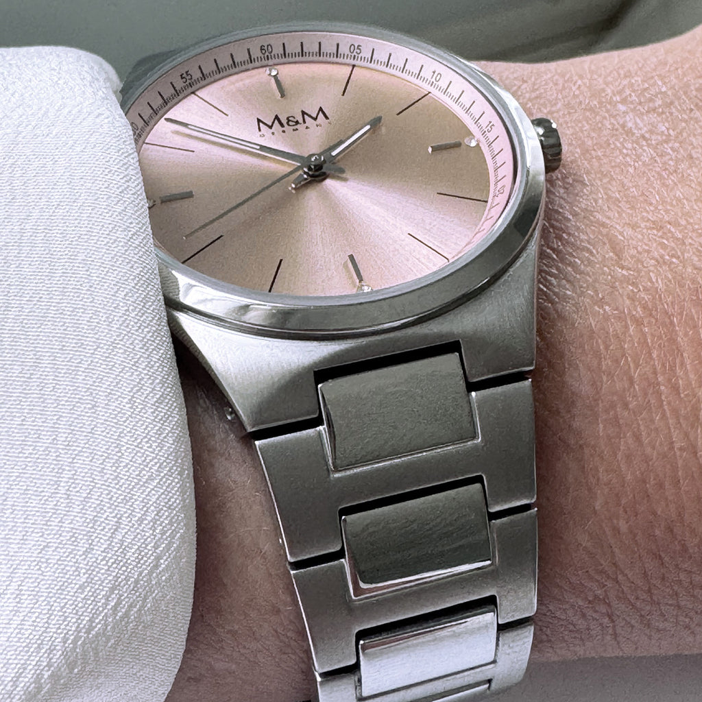 Zurückhaltend. Stark. Zeitlos. Die M&M New Classic 148 Damenuhr verkörpert pure Eleganz mit einem Hauch von klassischer Raffinesse. Ihr feines roségoldenes Zifferblatt trifft auf ein hochwertiges Edelstahlgehäuse und Edelstahl-Armband. 4 dezente Glanzpunkte auf dem Zifferblatt verleihen ihr feine Noblesse – inspiriert vom Stil derer, die nie Trends folgen, sondern Werte tragen.