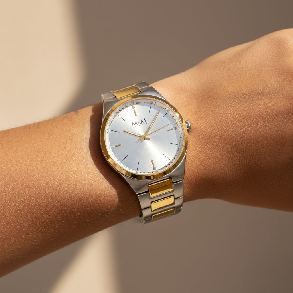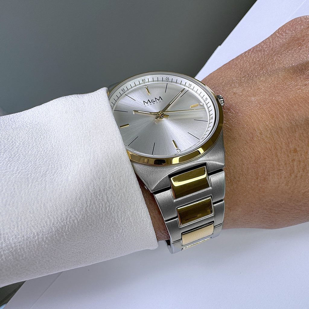 Zurückhaltend. Stark. Zeitlos. Die M&M New Classic 362 Damenuhr verkörpert pure Eleganz mit einem Hauch von klassischer Raffinesse. Ihr feines Zifferblatt trifft auf ein hochwertiges Edelstahlgehäuse und Edelstahl-Armband mit langlebiger 14K Echtvergoldung. 4 dezente Glanzpunkte auf dem Zifferblatt verleihen ihr feine Noblesse – inspiriert vom Stil derer, die nie Trends folgen, sondern Werte tragen.