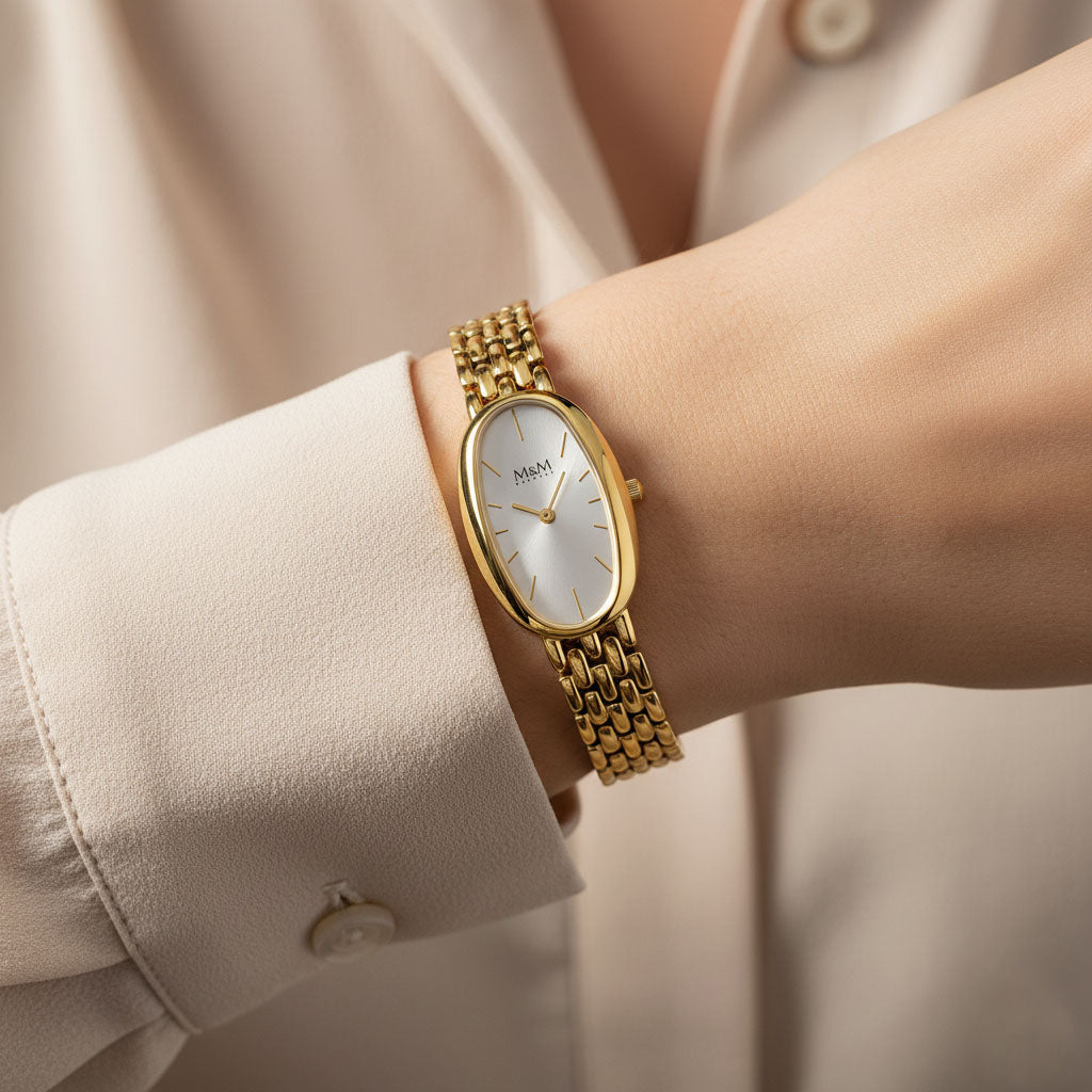 Das fein geschwungene, ovale Gehäuse der M11976 hat ein filigranes Metallband. Die Serie versprüht einen Hauch von Vintage-Chic. Ein femininer Look, der an die Eleganz vergangener Jahrzehnte erinnert – neu interpretiert für modernes Stilbewusstsein.