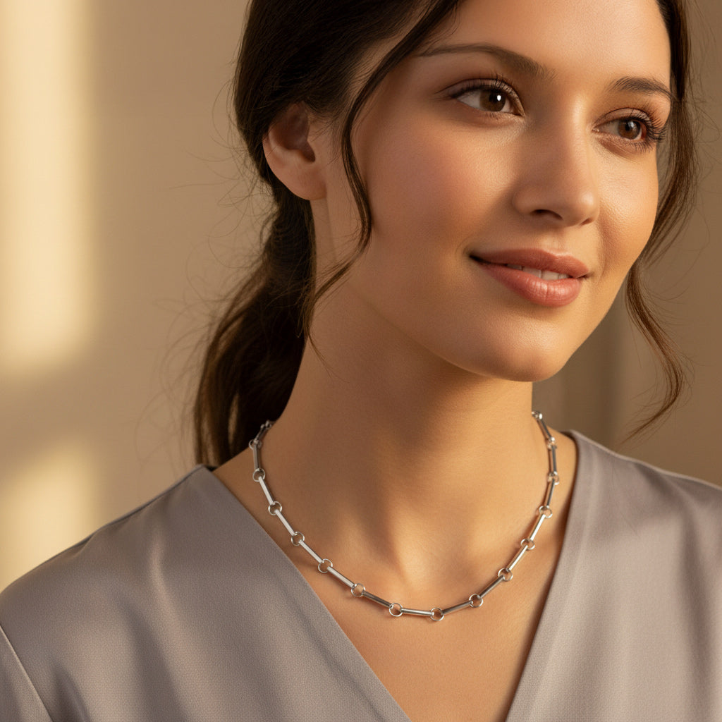Die Fine Line Schmuckstücke von M&M punkten durch sachliche Zurückhaltung und reine Form. Edle Klarheit und unverwechselbare Eleganz bestimmen die präzise, fein definierte Linienführung. Gefertigt aus hochwertigem Edelstahl besticht das Collier 488 durch seine grafische Gliederung der jedes Outfit stilvoll ergänzt. Die Kombination aus klaren Linien und fein abgestimmten Kreisen macht dieses Schmuckstück zum perfekten Begleiter für besondere Anlässe oder den Alltag. Die Kette ist hautfreundlich, angenehm zu tragen und überzeugt durch ihre hochwertigen Materialien und Verarbeitung – ein echtes Highlight für alle, die Wert auf exklusives, modernes Design legen.